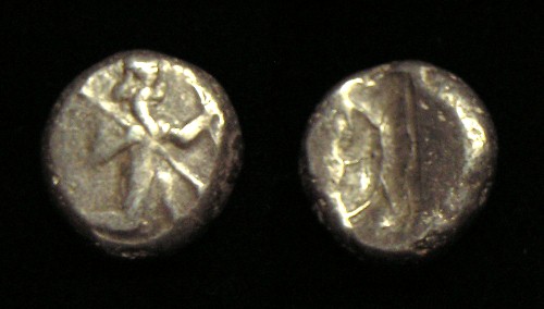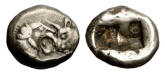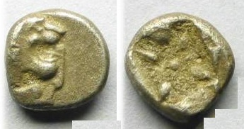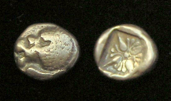 #10651: SILVER 1/12 Stater - 6th Cent BC, Historical Context: This coin was minted in MILETOS about 515 to 480 BC. Miletos was located on the southern coast of IONIA in western ASIA MINOR. It was minted during the 4th Century BC. It was one of the earliest mints, though its prosperity was greatly curtailed following the defeat of the Ionian revolt against Persia about the early 5th Century BC. It was the "Mother City" of many famous colonies, including Abydos, Kyzikos, Sinope, and Pantikapaion. Obv: Lion, Facing Right, off center SOLD $59.95 plus shipping