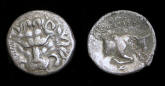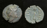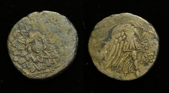 on the eastern coast of Pan, a personification of lust and outdoors, god of flocks and shepards. Assoicated with reed flute and dancing fauns. He has often appealed to by armies for aid in routing their enemies. Obv: Head of Pan, Pan,