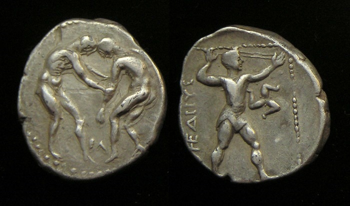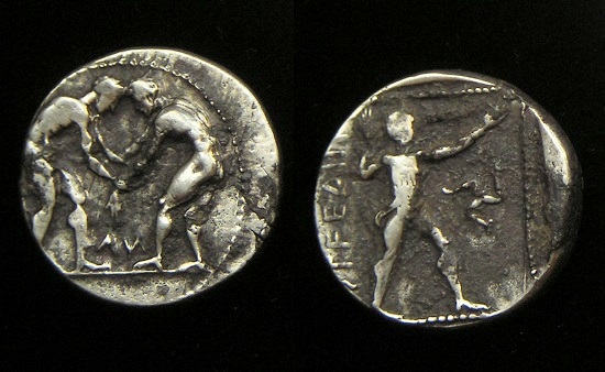 to 330 BC, Grappling Wrestlers / Slinger Commemorates Ancient OLYMPIC GAMES Historical Context: See above Obv: Wrestlers BUY NOW $249 plus shipping