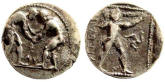 PERSIAN NEMESIS of the Ancient GREEKS Historical Context: These coins were minted in Asia Minor by the Persian Empire about the late 6th Century BC to early the 5th Century BC. At the time, Persia was the vast empire to the east of the Greek World. Western Asia Minor was the birthplace of coinage (about 620 BC). The Persians invaded about 546 BC initially copying the existing Lydian coinage. This coin is the first of the Persian-style coinage issued by the Persians in Asia Minor. The Persian occupation of Asia Minor was the historical event that eventually led to Alexander the Great's invasion of Persia in response. Obv: Darius the Great kneeling holding Spear