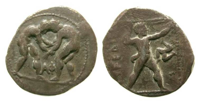 to 330 BC, Grappling Wrestlers / Slinger Commemorates Ancient OLYMPIC GAMES Historical Context: See above Obv: Wrestlers