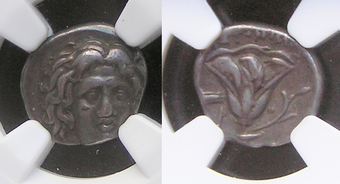 large and important island off the SW coast of HELIOS: The sun-god who crosses the sky from east to west each day. He sees and hears everything. He was identified with Apollo. Obv: Helios with Radiate Crown BUY NOW $219 plus shipping