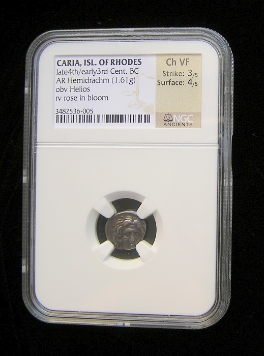 #10942: Silver Hemidrachm - late 4th to early 3rd Century BC, NGC Certified - VF Grade, Strike 3/5, Surface 4/5 Historical Context: See above Obv: Helios with Radiate Crown BUY NOW $199 plus shipping