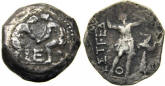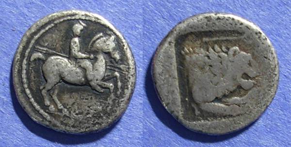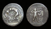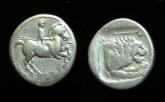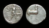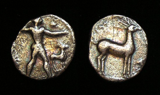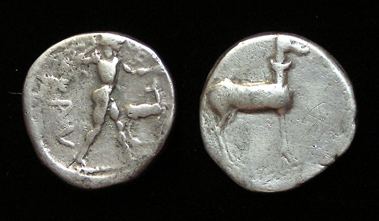 #9723: Silver Nomos - 475 to 425 BC, Historical Context: This coin was minted in Obv: Apollo advancing right, Stag at his Feet