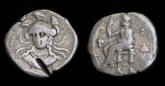 #11455: Silver Nomos - 475 to 425 BC, Historical Context: This coin was minted in Obv: Apollo advancing right, Stag at his Feet BUY NOW $239 plus shipping
