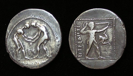 Stater - 400 to 385 BC, Grappling Wrestlers / Slinger Commemorates Ancient OLYMPIC GAMES Earlier Issue of this Coin - Older than others below Budget Piece Historical Context: This coin was minted in ASPENDUS around 400 to 385 BC. The City of Aspendus is on the southern coast of Asia Minor (Pomphylia). These coins were struck to commemorate the ancient athletic games (Pan-Hellenistic Games). These Games were held in four cities, Olympia, Nemea, Corinth, and Delphi. The Olympic Games were part of this circuit when held in Olympia!! These coins are typically referred to as THE WRESTLERS OF ASPENDUS and are amongst the most collectable of all ancient coins!!! The obverse (front) of this coin is TWO WRESTLERS grappling in a GRECO-ROMAN WRESTLING MATCH!!! The reverse scene is a SLINGER. The slinger honors the city’s soldiers. Obv: Wrestlers BUY NOW $279 plus shipping