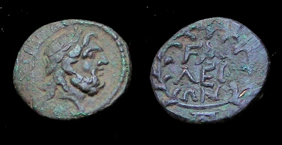 #11666: Greek BRONZE - 3rd Century BC OLYMPIA - Site of Ancient Olympic Games Historical Context: These coins were minted in Olympia, a sanctuary of ancient Greece in Elis, is known for having been the site of the Olympic Games in classical times. The games were held every Olympiad (i.e. every four years), the Olympic Games dating back possibly further than 776 BC. The classical period, between the 5th and 4th centuries BC, was the golden age of the site at Olympia. A wide range of new religious and secular buildings and structures were constructed. The Temple of Zeus was built in the middle of the 5th century BC, its size, scale and ornamentation was beyond anything previously constructed on the site. Further sporting facilities, including the final iteration of the stadium, and the hippodrome (for chariot-racing) were constructed. The Prytaneion was built at the north west side of the site in 470 BC. Obv: Zeus