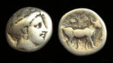 coin was minted in TRIKKA, Obv: Youth wrestling Bull