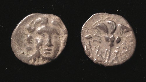 #11116: SILVER Didrachm - 4th Cent BC, RARE and Collectable type Historical Context: This coin was minted in IONIA in the 4th Century BC. Ionia is located on the southern coast in western ASIA MINOR. Obv: Lion Scalp Facing SOLD $229 plus shipping