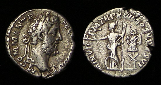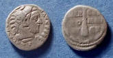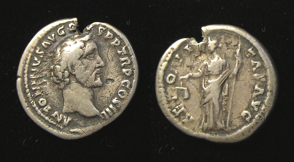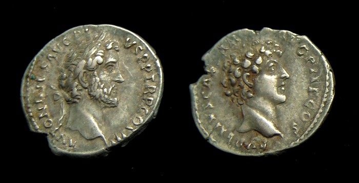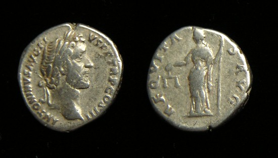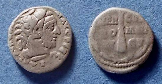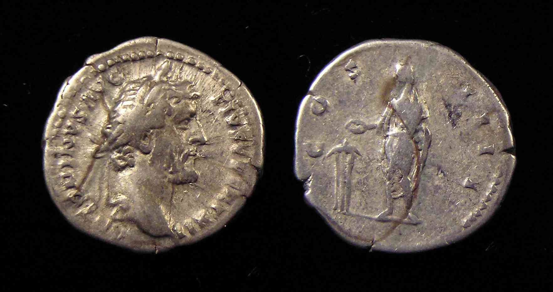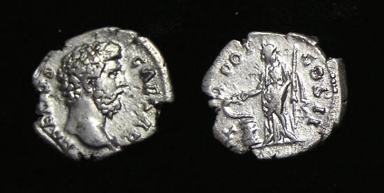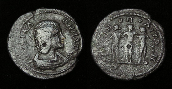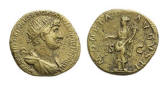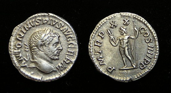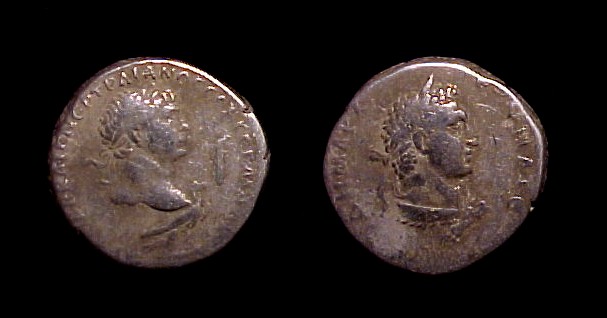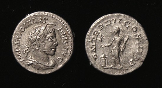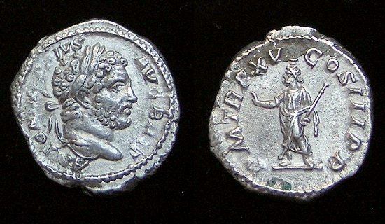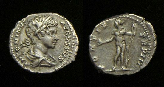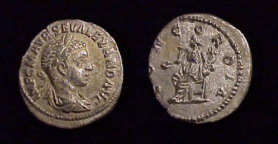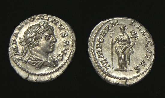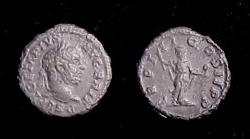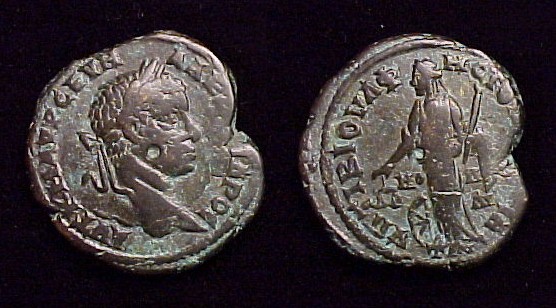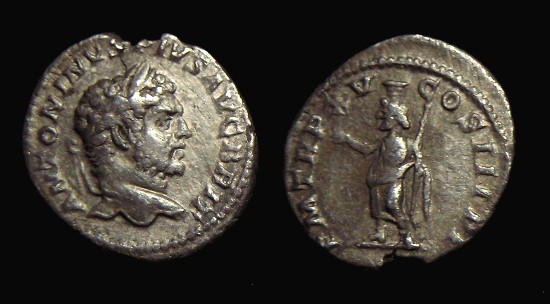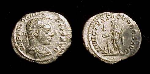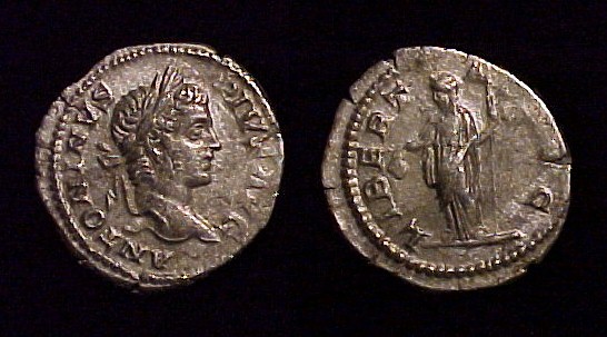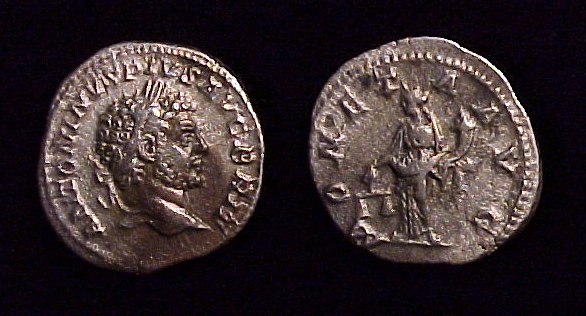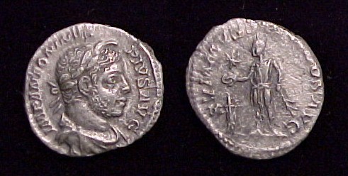CARACALLA Historical Context: These coins were minted by the ROMAN EMPIRE during the reign of CARACALLA (198-217 AD). M. Aurelius, originally named Bassianus, the elder son of Severus. In 198 was created Augustus, although only ten years of age. On the death of Severus, Caracalla reigned jointly with his brother Geta. However, he had Geta assassinated, reportedly while in the arms of his mother. His reign was marked by extravagance and cruelty. He achieved more by treachery than by force of arms. He had his portrait (as an adult) potrayed with a skowl so that the Roman people would fear him. The one notable action attributed to him, was giving to all free inhabitants of the Empire the privileges of Roman citizens. He was part of the SEVERAN DYNASTY, which lasted a number of generations and included some of the oddest people ever to rule Rome.