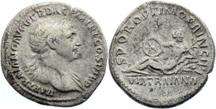 TRAJAN Earliest of the Great Emperors of ROME'S GOLDEN ERA 98 to 117 AD Historical Context: These coins were minted by the ROMAN EMPIRE during the reign of TRAJAN ( 98-117 AD). Marcus Ulpius Trajanus held several military posts and was eventually appointed governor of Upper Germany by Nerva who adopted him. On his succession, Trajan decided that the time was ripe for territorial expansion and he successfully undertook the conquest of Dacia which then became a Roman province. Trajan became emperor through his adoption by Nerva. He later adopted Hadrian as his successor. They are known as the adoptive emperors. This was the Golden Era of Rome.