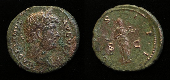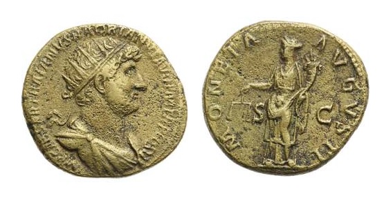#8782: Bronze Dupondius, HADRIAN, 117 to 138 AD with Eternity Holding Heads of Sun and Moon BIG FLAN Historical Context: See above "Historical Context." Obv: Hadrian SOLD $169 plus shipping