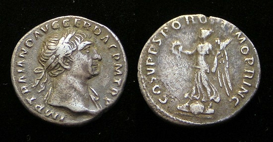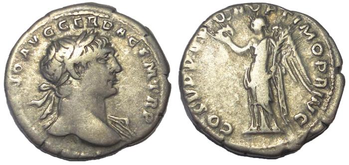 #11238: Denarius, TRAJAN, 98 to 117 AD, with VICTORY Historical Context: See above "Historical Context." Obv: Trajan SOLD $89.95 plus shipping