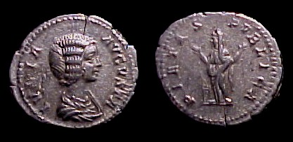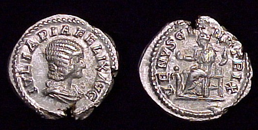 SILVER Denarius - 198 AD, Julia Domna - Wife of Septimus Severus Hilaritas Historical Context: See above "Historical Context." In addition, she was one of the most powerful women to serve Rome. She engineered the accession of her nephews after the deaths of her sons, Geta and Caracalla. Obv: Julia Domna BUY NOW $69.95 plus shipping