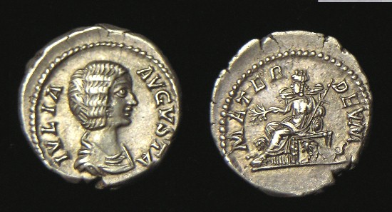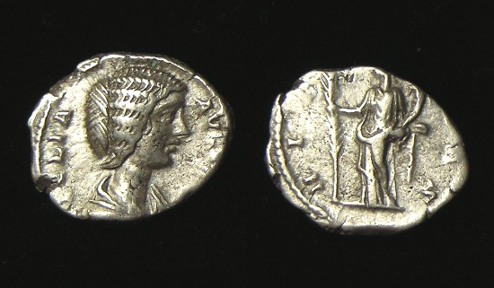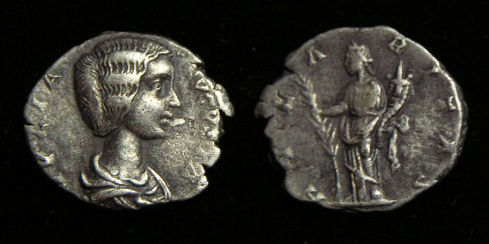 SILVER Denarius - 198 AD, Julia Domna - Wife of Septimus Severus Issue under CARACALLA (her son) Historical Context: See above "Historical Context." In addition, she was one of the most powerful women to serve Rome. She engineered the accession of her nephews after the deaths of her sons, Geta and Caracalla. Obv: Julia Domna BUY NOW $89.95 plus shipping