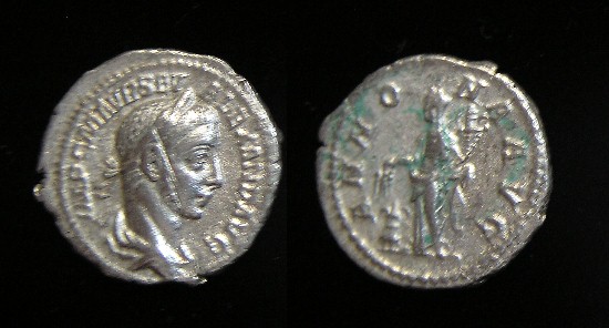#9504: SILVER Denarius - 230 AD, Severus Alexander ANNONA - Goddess of the Grain Harvest Historical Context: See above "Historical Context." Obv: Severus Alexander SOLD $49.95 plus shipping