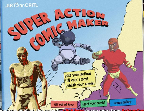 Comic Maker Build a six frame comic. The Super Action Comic Maker has a drag and drop interface which students use to select a background and character for their comics. | |||||