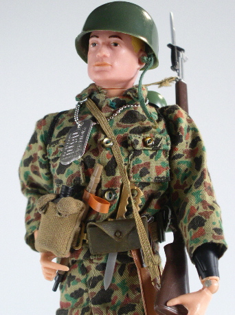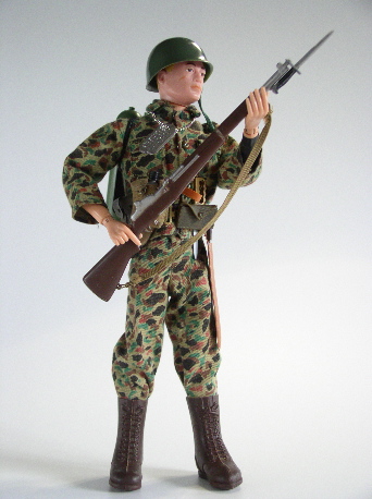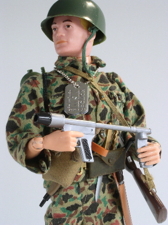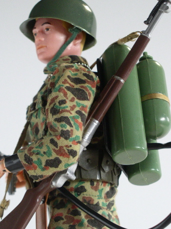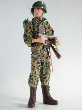 in colour), long brown boots, Combat helmet. Plain green flame thrower