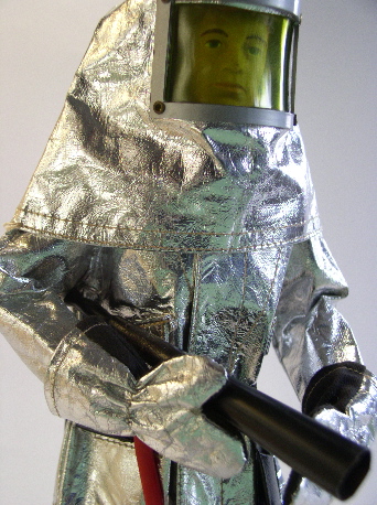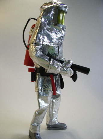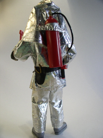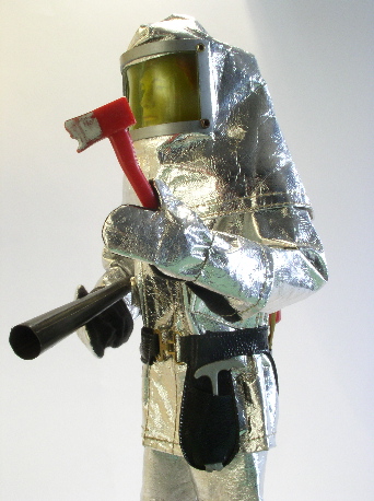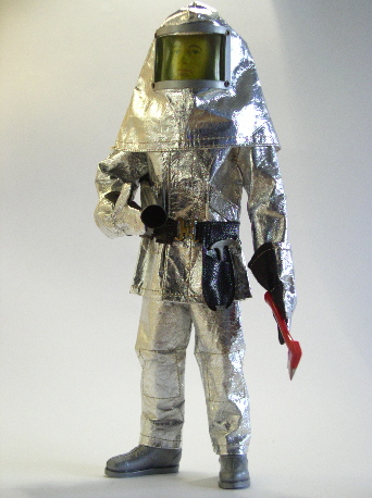 trousers, protective hood & visor, gloves and short silver boots. Crash tool