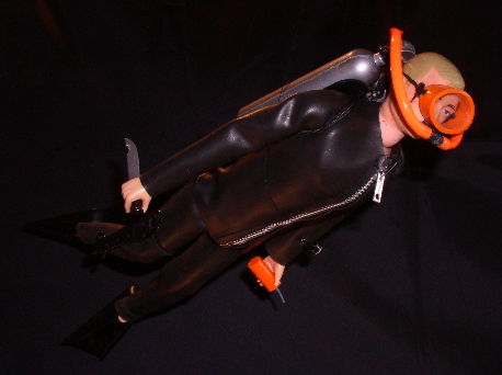 Grey air cylinders and orange hose to mouth piece, face mask, swim fins,