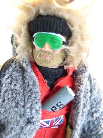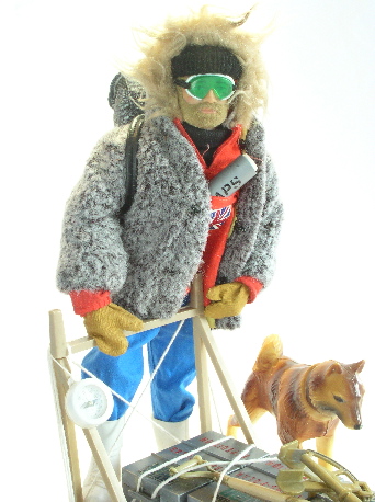 trousers and braces, brown gloves. Fur anorak. Goggles with