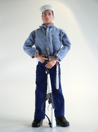 Sailor in dress fatigues, white dress rifle and bayonet (tucked in pants),