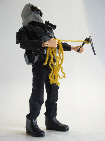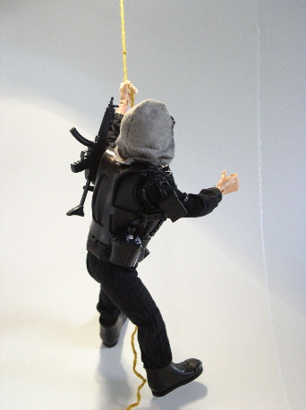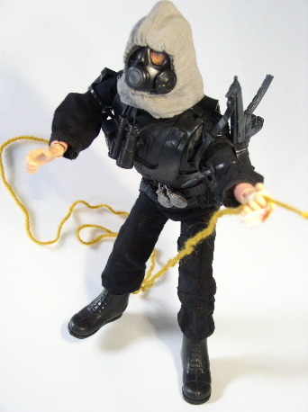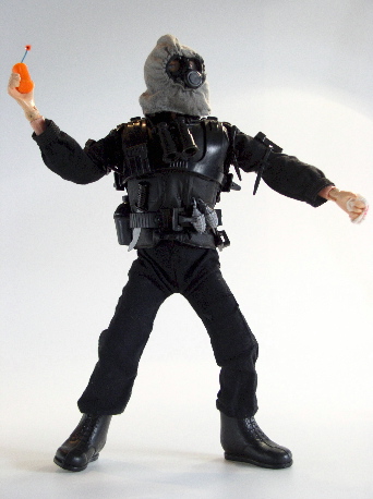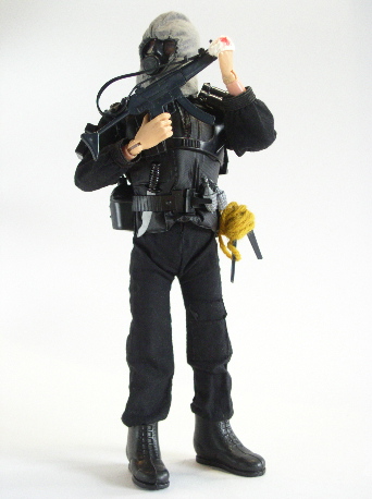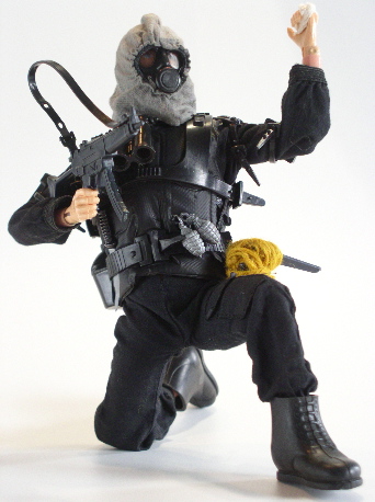 mask, light grey hood, Heckler & Koch m/c gun with curved magazine, knife