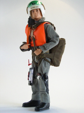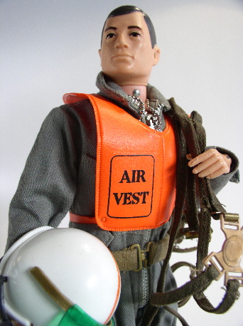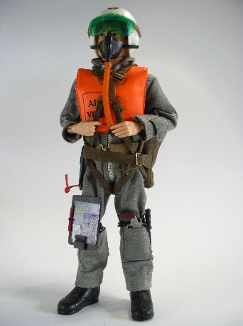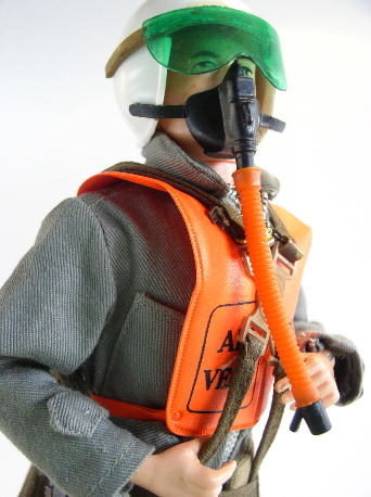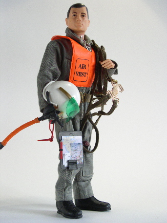 flight suit with zip, short black boots, helmet with paper stickers and