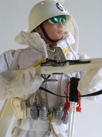 rifle with black elastic strap. White camouflaged field back pack, 4