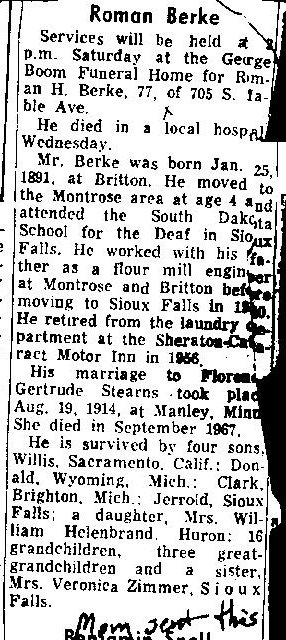 Mr. Berke was born January 25, 1891 at Britton. He moved to the