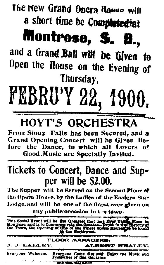 More information about Opera House. This is an excerpt from MONTROSE MEMORIES Page 122 In February 1922, a disastrous fire in Hegre's Hall over his garage caused $20,000 fire loss in Montrose. A big dance had been held which closed at the usual hour. A couple hours later Lon Wheeler discovered a blaze. The cement block building was erected by H. Berke nearly 20 years before as an opera house, but later occupied by Oscar Hegre as a garage and dance hall. The firemen quickly attached the hose and two streams of water turned on the flames. The fire caught in the floors and roof at an amazingly rapid rate. It was soon seen that the big building was doomed. The firemen then turned their attention to the A.O.U.W. Hall, a one-story frame structure just east of the burning garage and by the heroic work of the firemen was held there. The Masonic and Eastern Star Lodges occupied the A.O.U.W. Hall. The fittings and furniture used by them was removed and taken to the street. This hall was completely wrecked and gutted by the fire, which was intense for about an hour. In the meantime, it looked as if there was no chance whatever to save the Herald building which was next east of the Hall. By advice of the Fire Chief, Henry Halbritter, and the Captain, John Kruse, the crowd began to remove the printing fixtures, machinery and furniture to the street. Some damage was done, but during the afternoon the machines were set in motion once more and the work of setting type on the Herald was resumed. If the Herald building had gone, the flames likely would have reached the Bryne's Department Store. The South side of Main Street would have been destroyed. Bert Baker's household goods were stored in the upper rooms of the big cement garage and were all consumed. One of the school buses was lost in the flames, also the Franklin car of J.F. Gordon and a number of other cars, which were in the building. There was so much wood used in the construction of this old opera house that it made it the hottest fire we ever saw when it fell into the basement. A few words of praise of our volunteer firemen for their efforts which were most intelligently directed by the officers and efficiently carried out by the members of the company-never saw better work by professionally paid firemen than done by Montrose Volunteer Firemen.