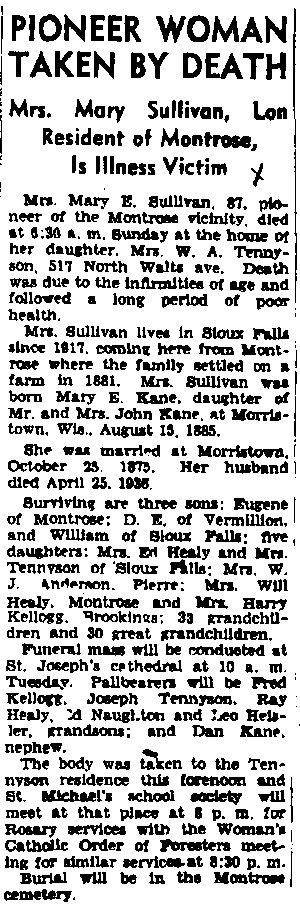 settled on a farm in 1881. Mrs. Sullivan was born Mary E. Kane,