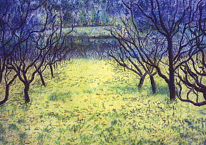 الطبيعة، فبمقدمة صفراء تميل للخضرة، ثمة أشجار بجذوع