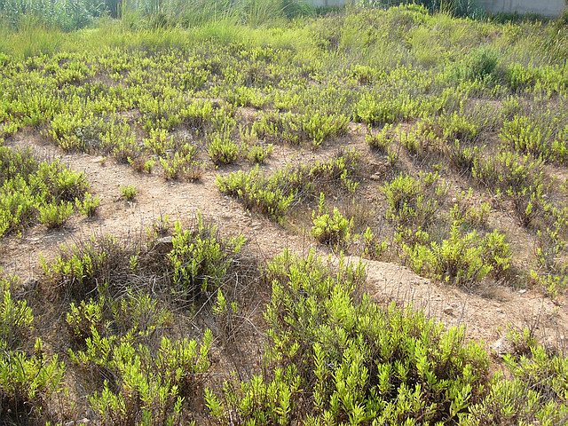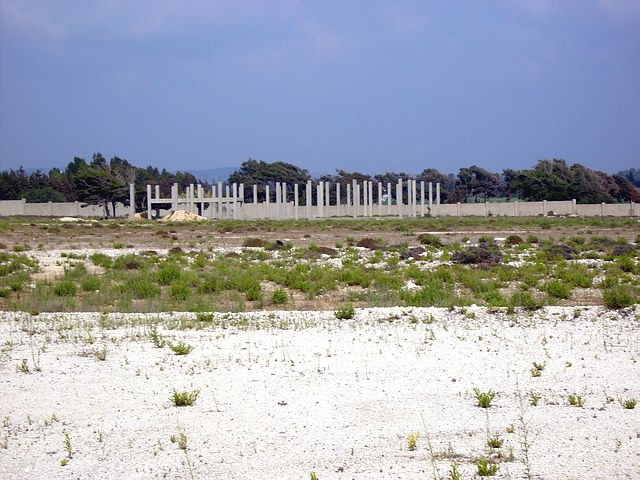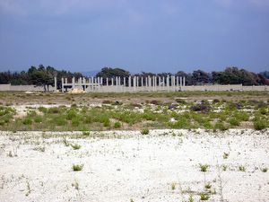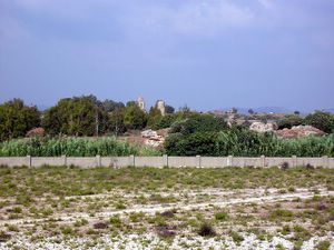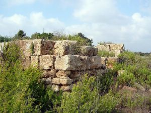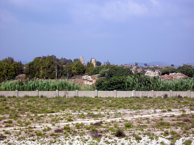 A small side from the big wall that surrounds the area and the entrance is appearing in the picture. The wide area (notice the wall infar from camera to the right)which was settled and spread out by small stones after removing   all the ruins from it   (the picture was taken from a hill in the same area)